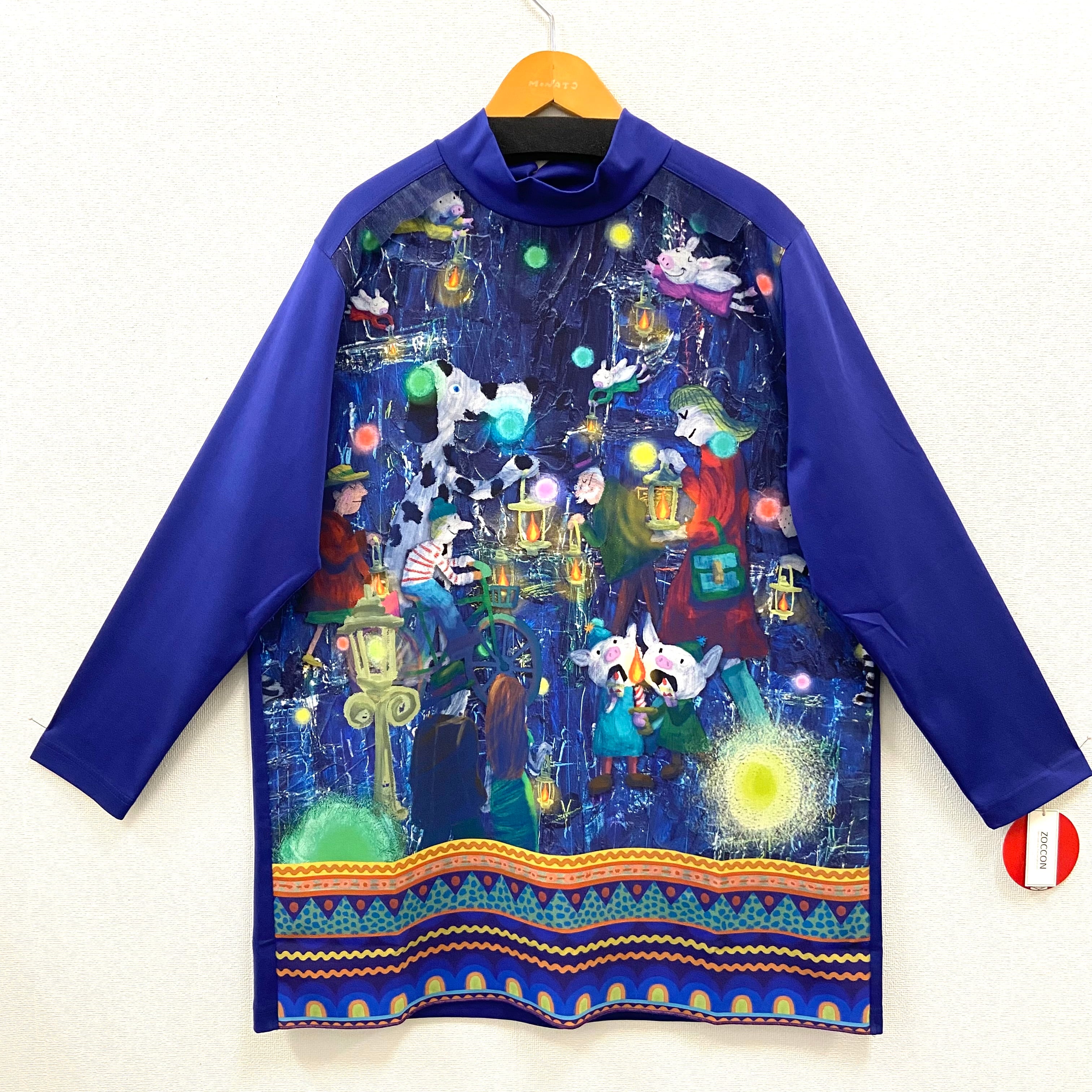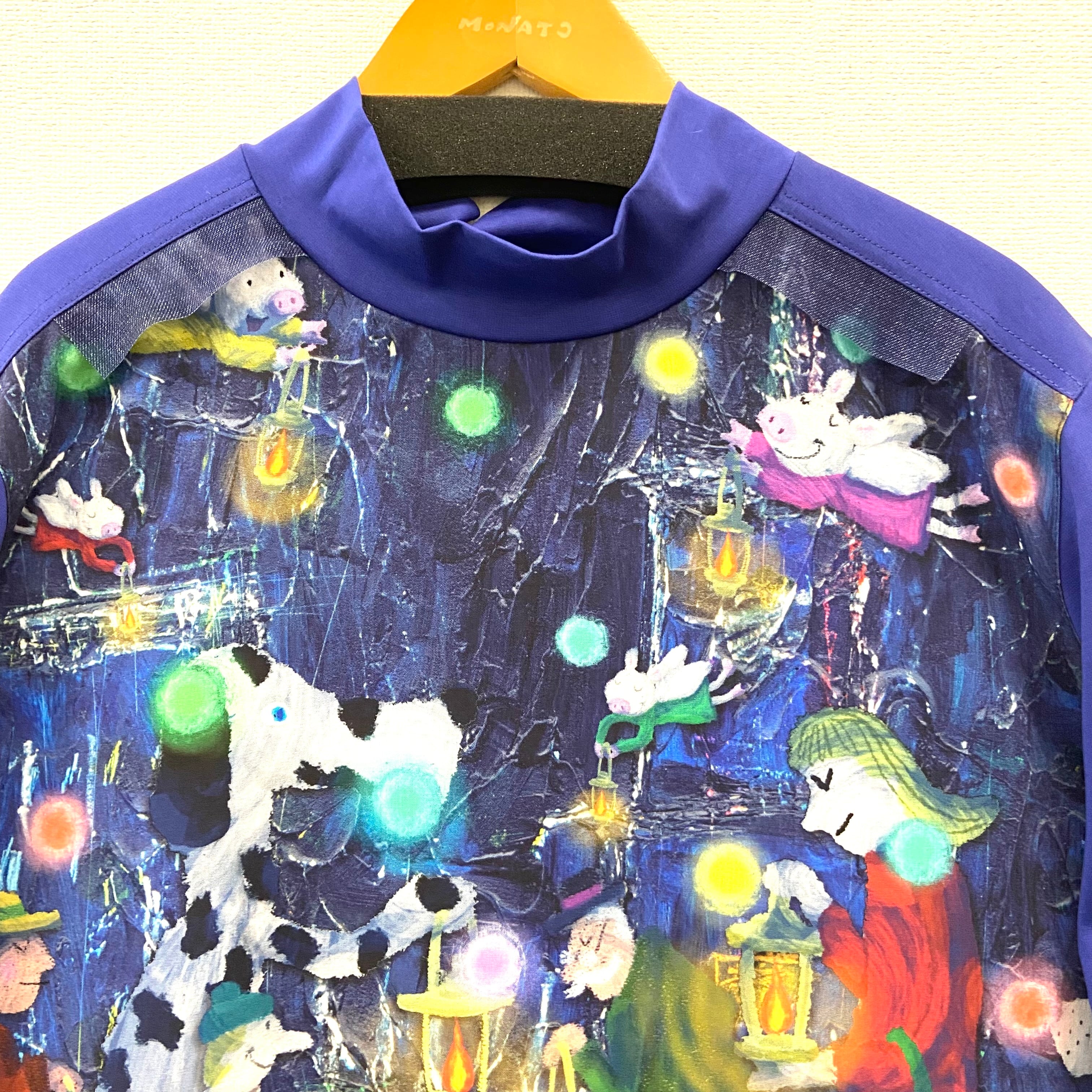 前身頃はプリント生地を使用し袖と後身頃は無地のポンチ素材で後ろ首下にミシン刺繍が施されています