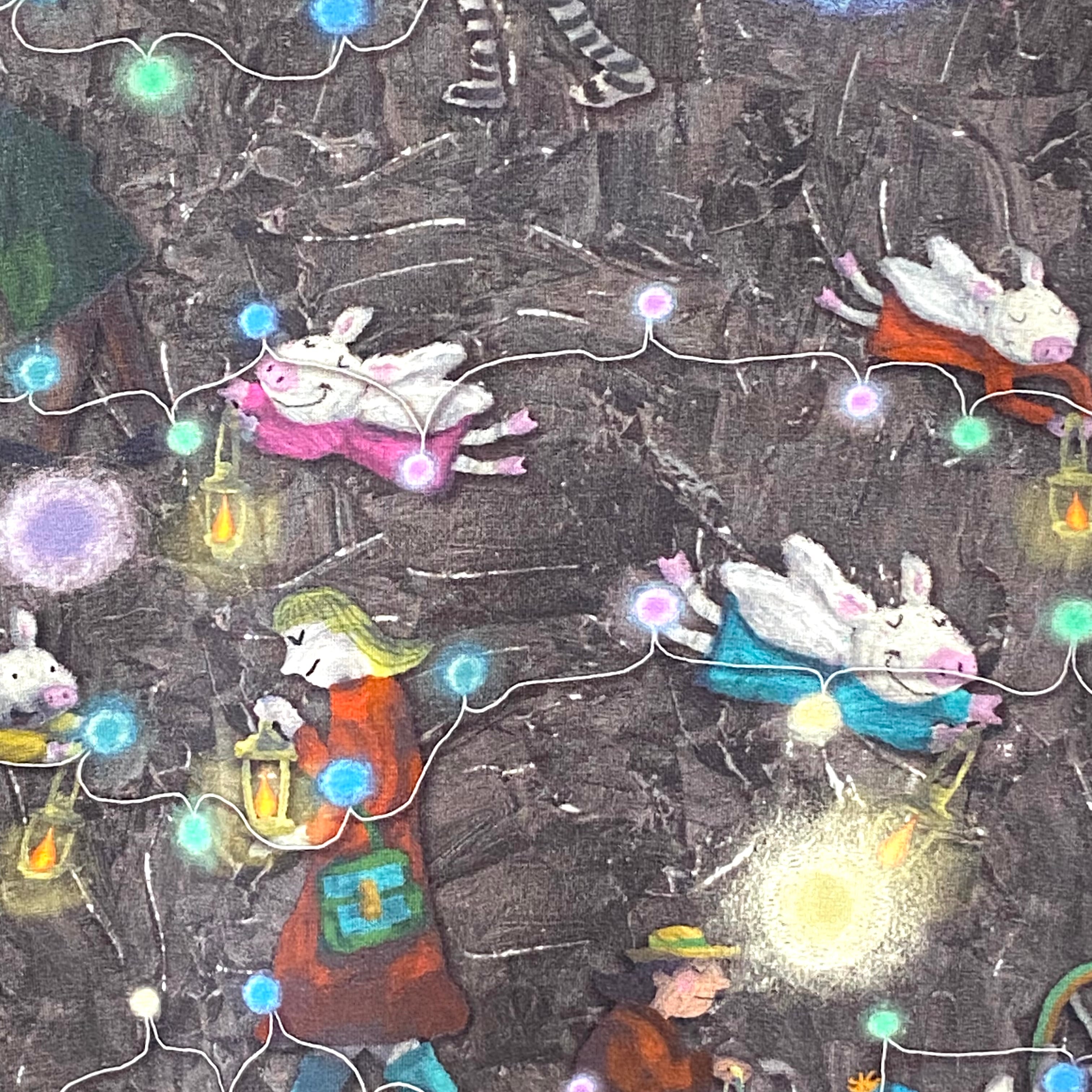 長い冬の夜に天使が作り出す柔らかいあかりが灯り気持ちも暖かくなるというストーリーを描いたイラストです