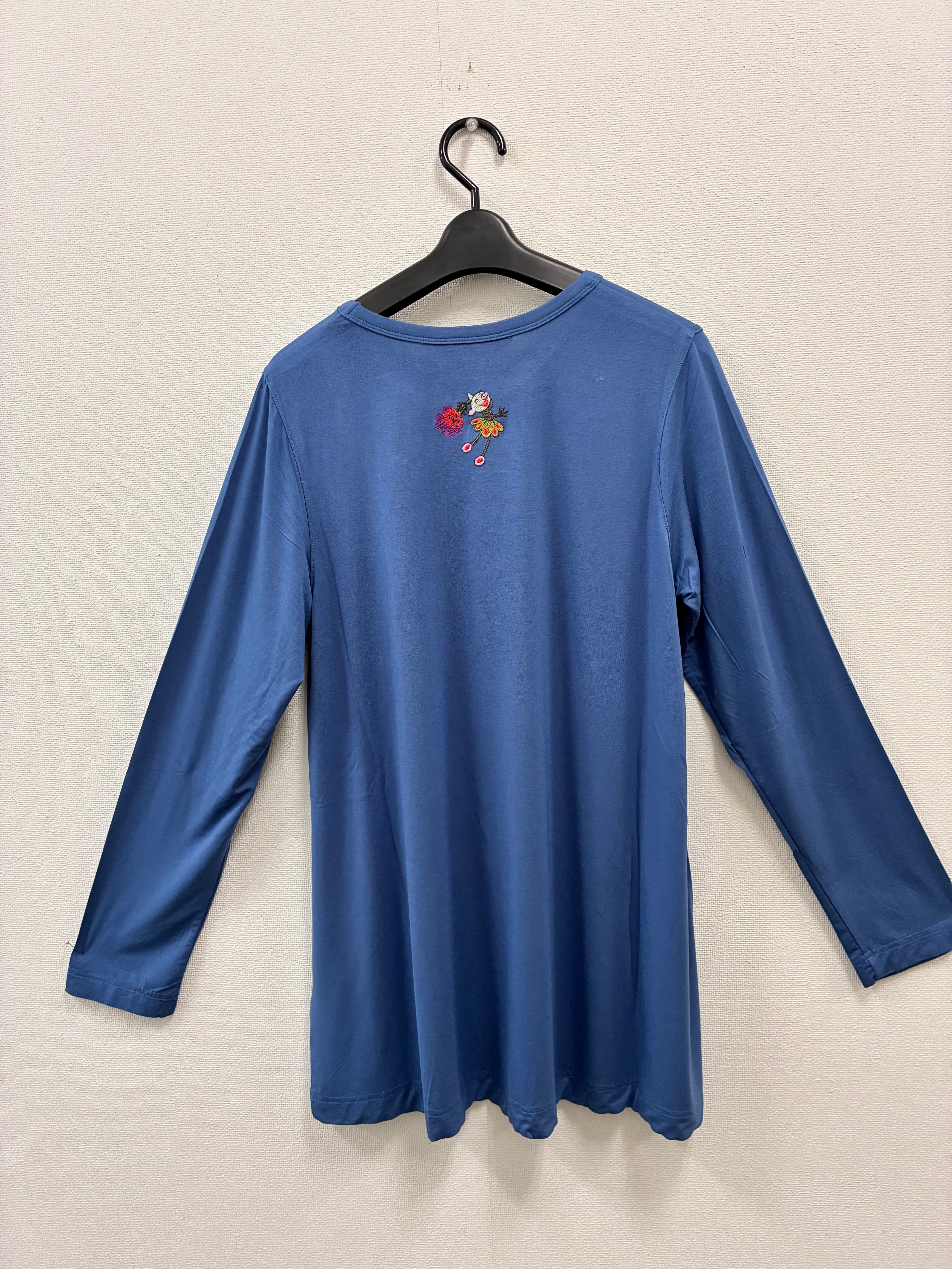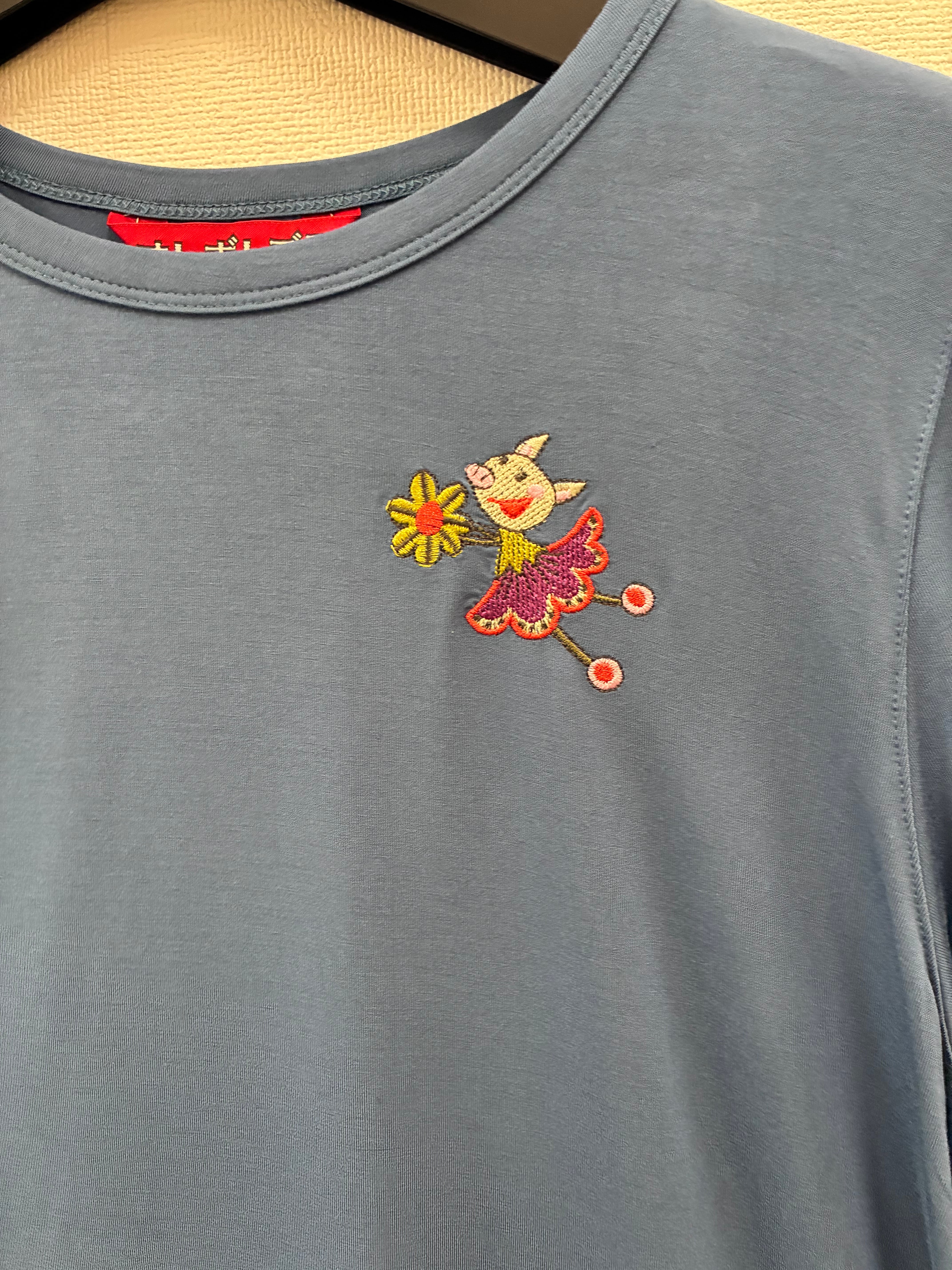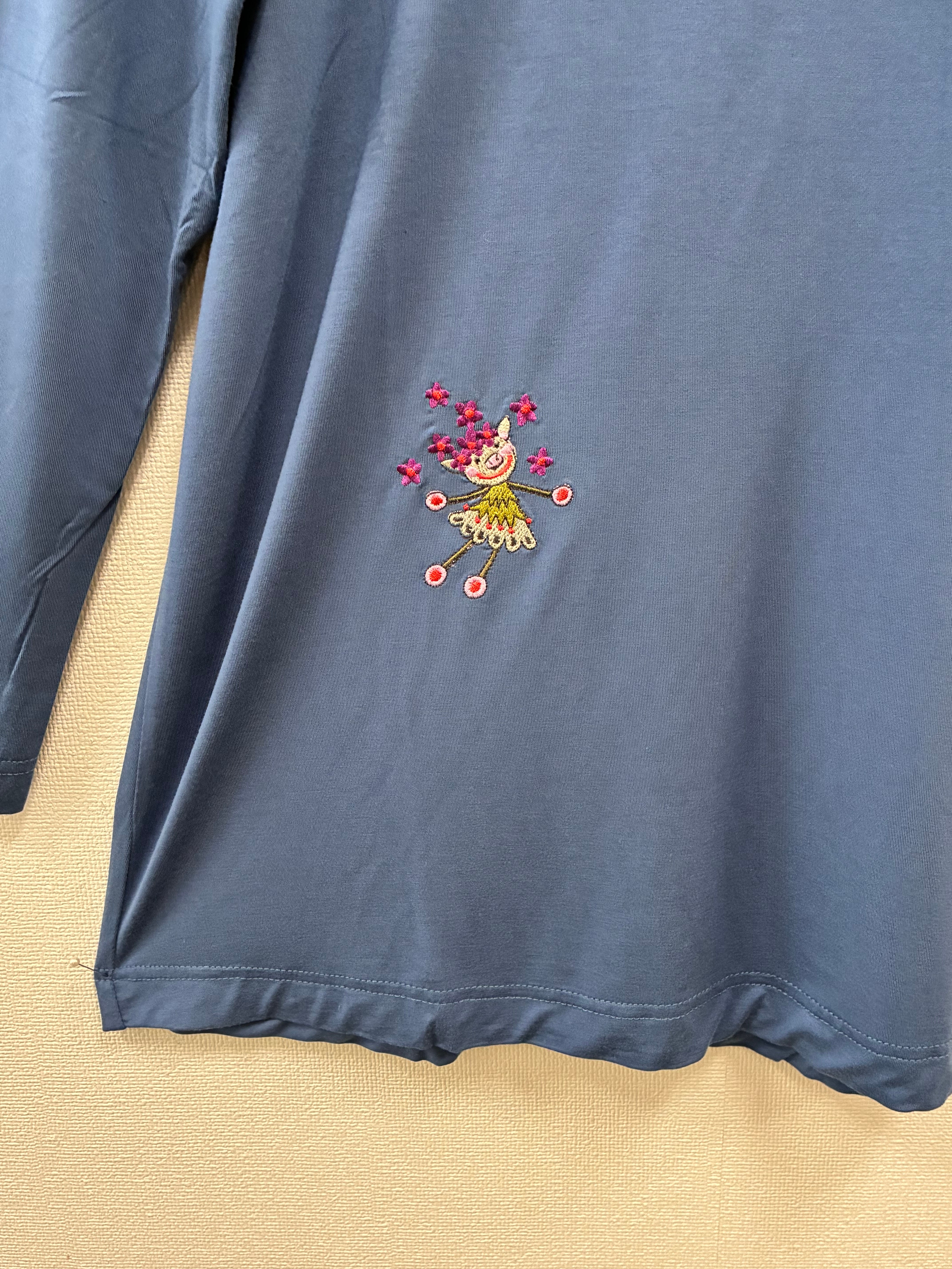 左胸元 右隅 背中にミシン刺繍が施されています