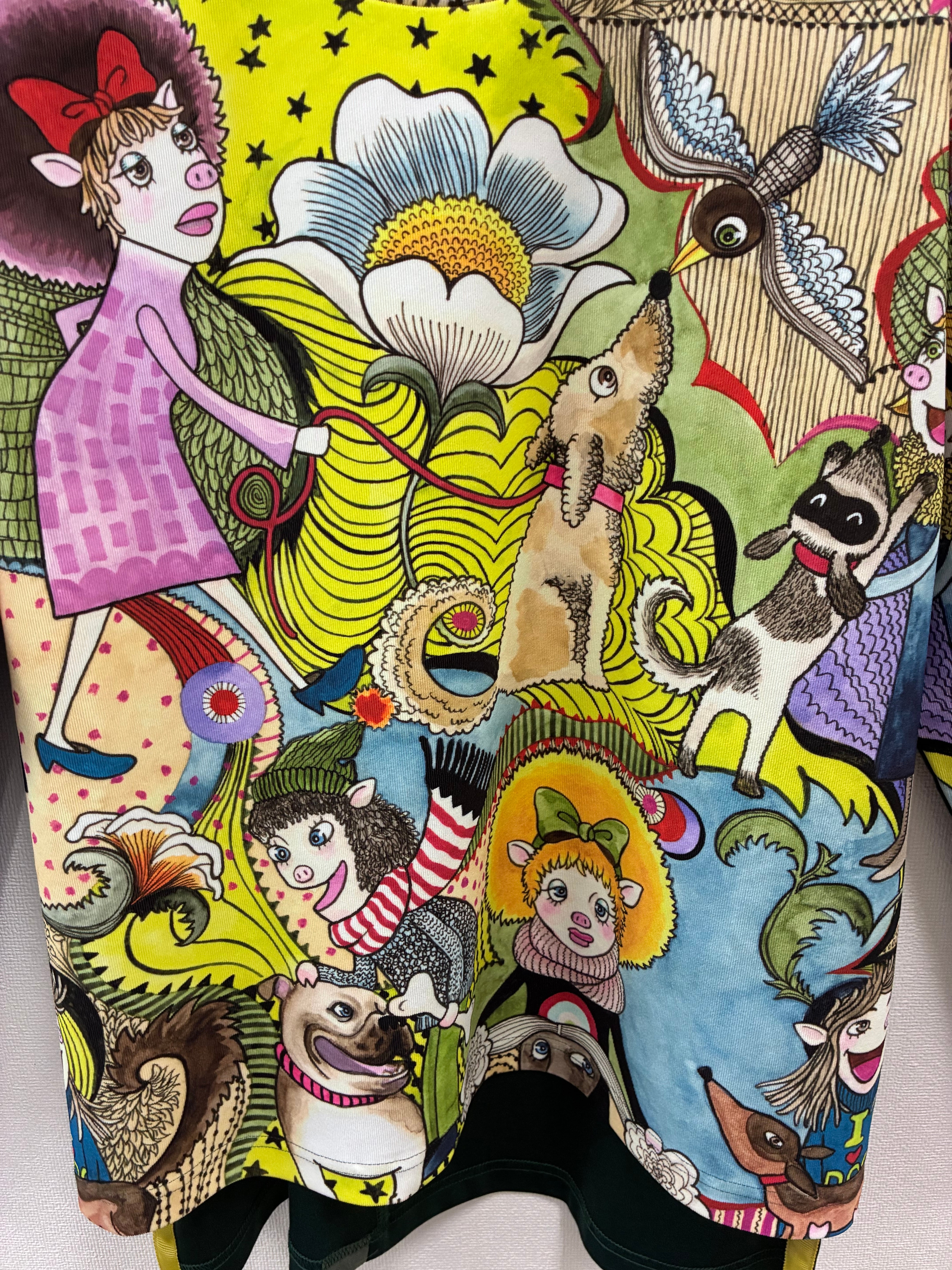 女の子に扮したブタちゃんが犬のお散歩わしているプリントです