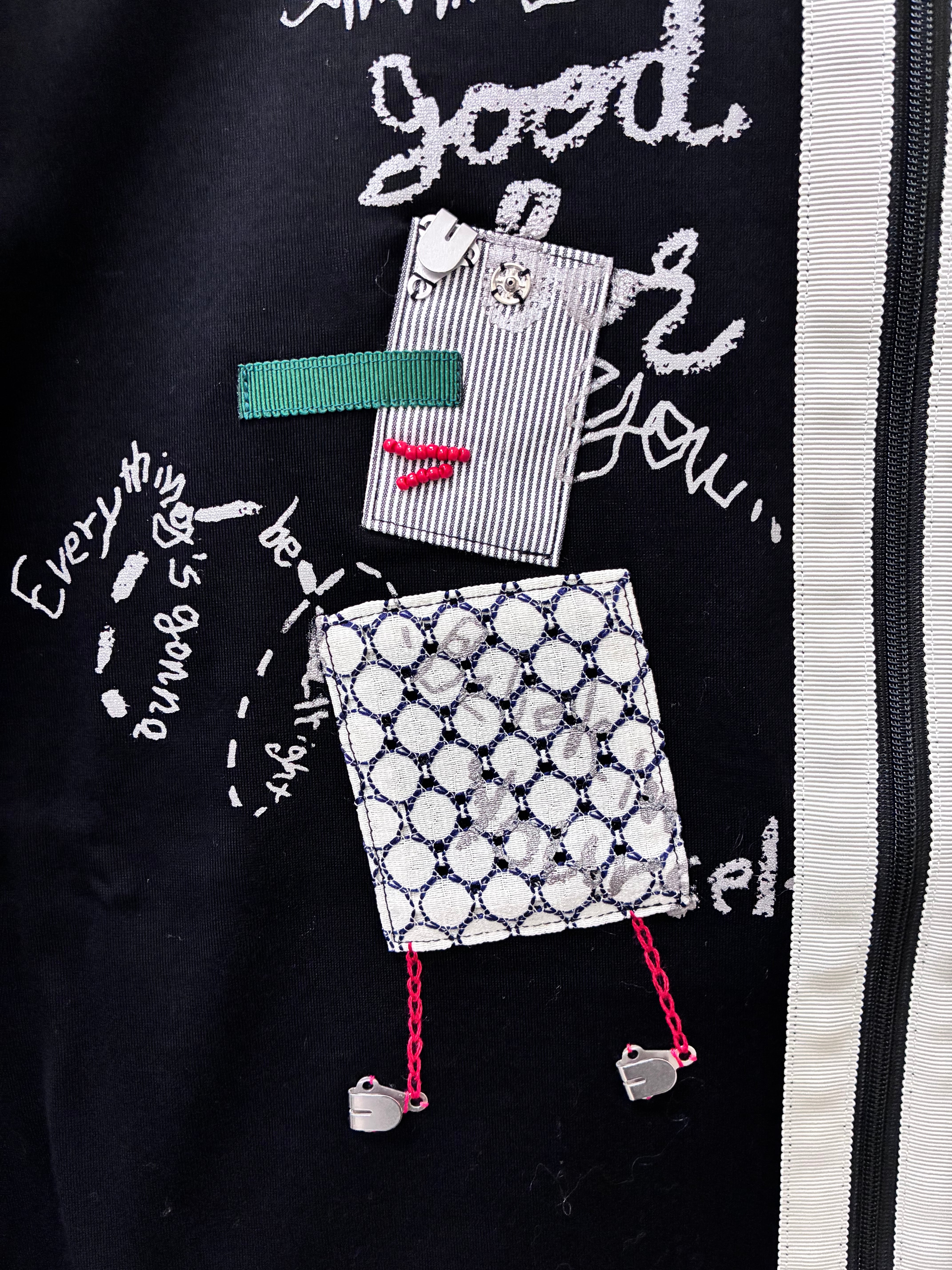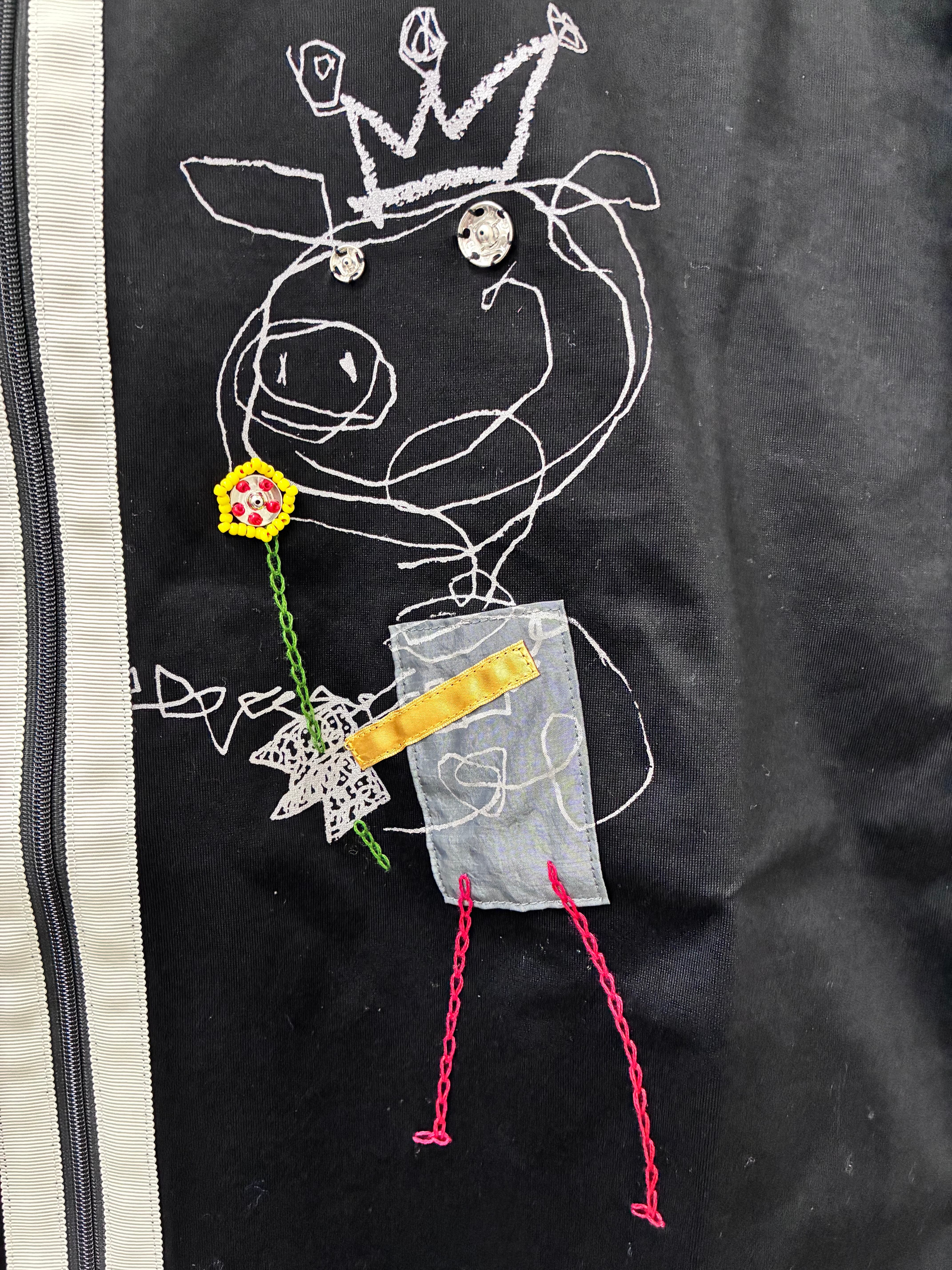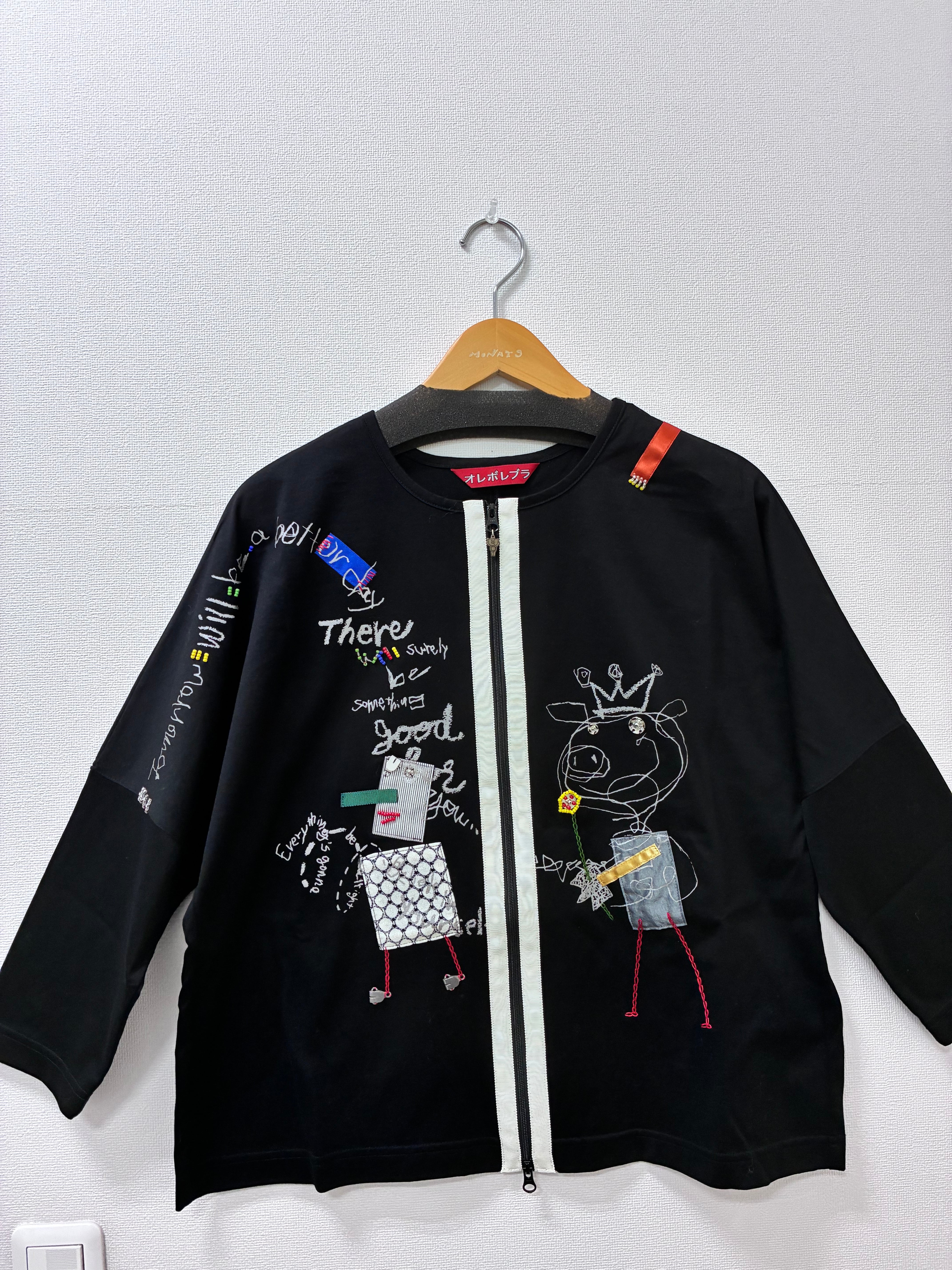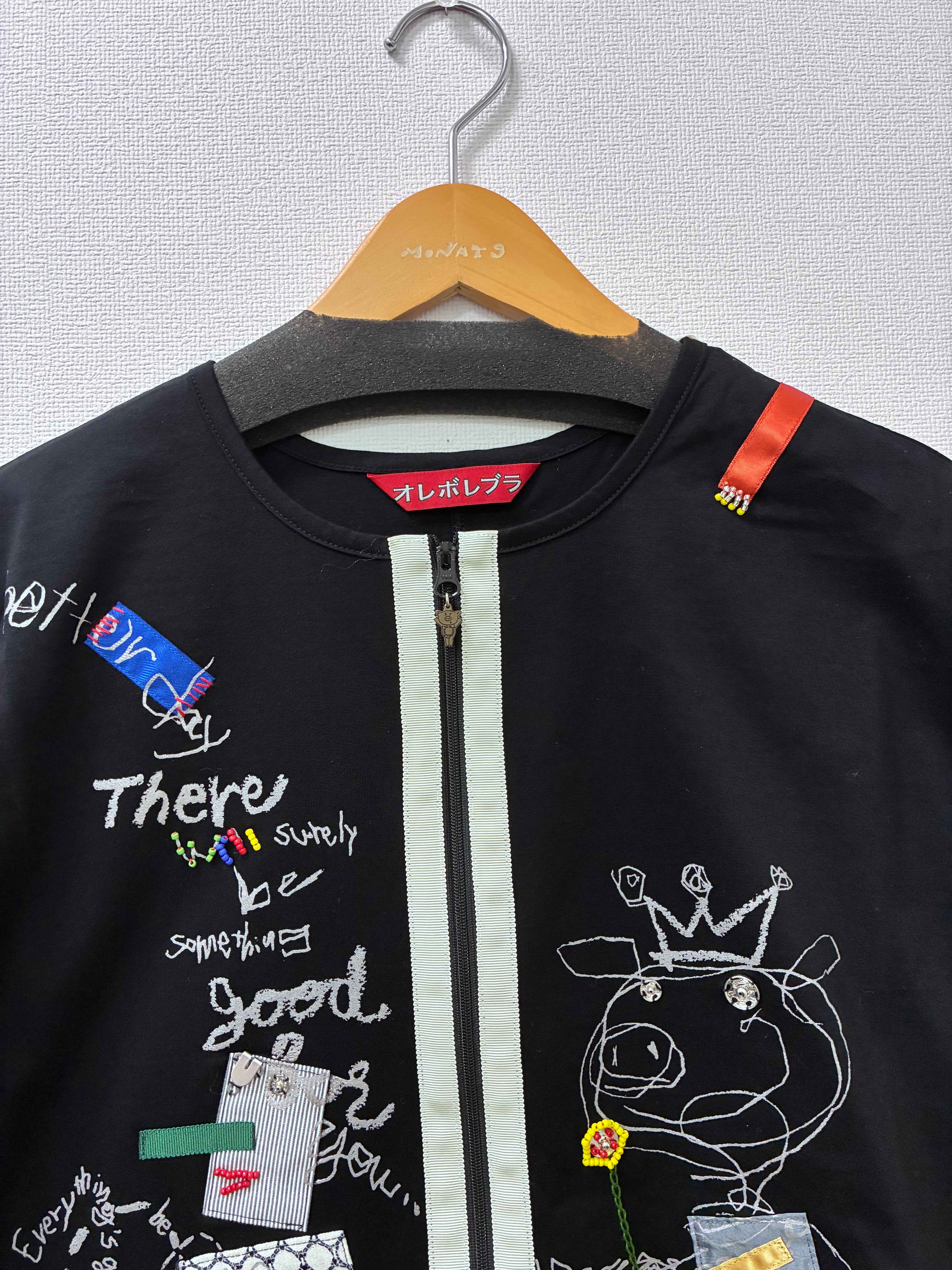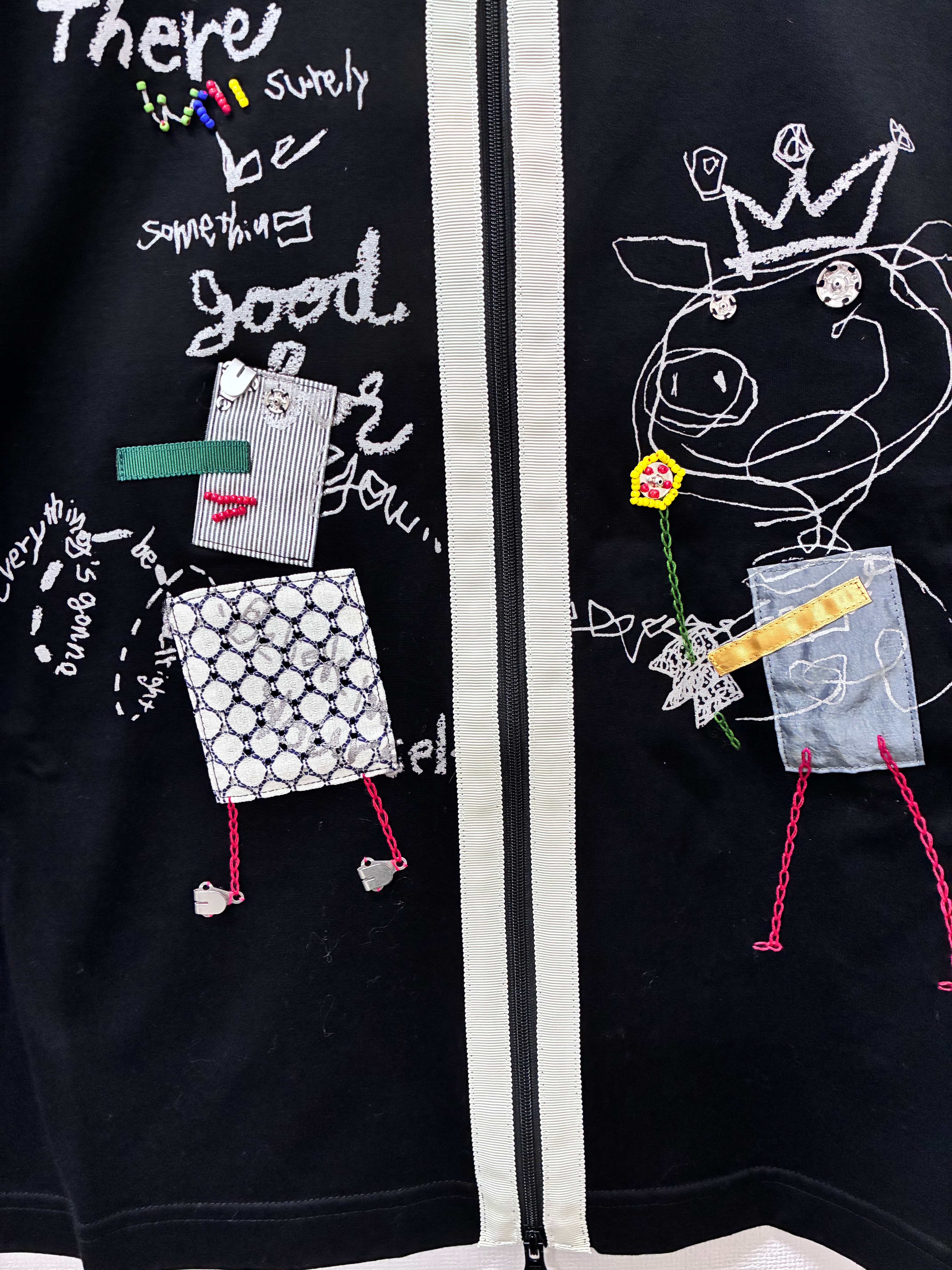 プリントにビーズやスナップ ホックなどのパーツを使ってアップリケや刺繍が施されたデザインです