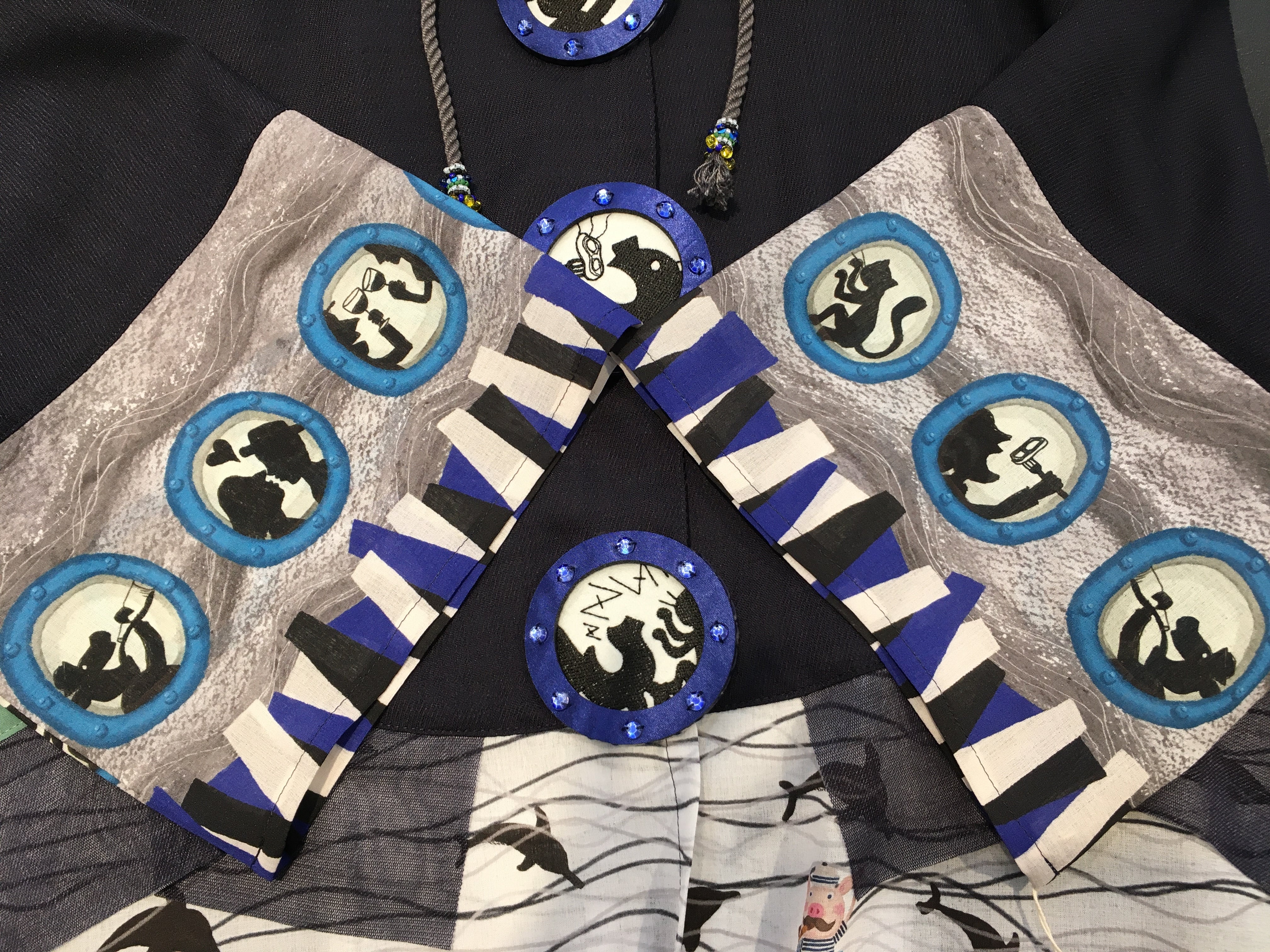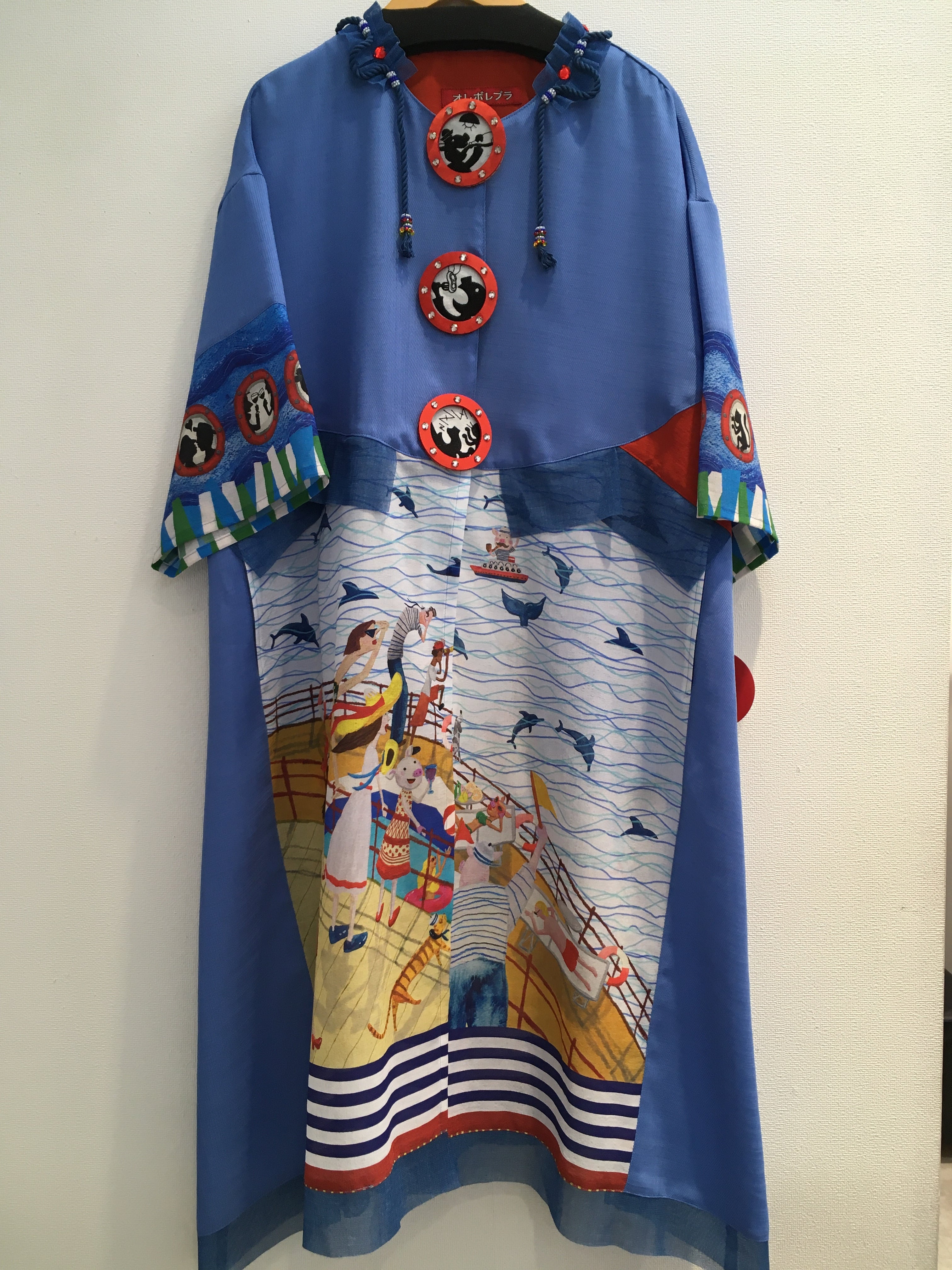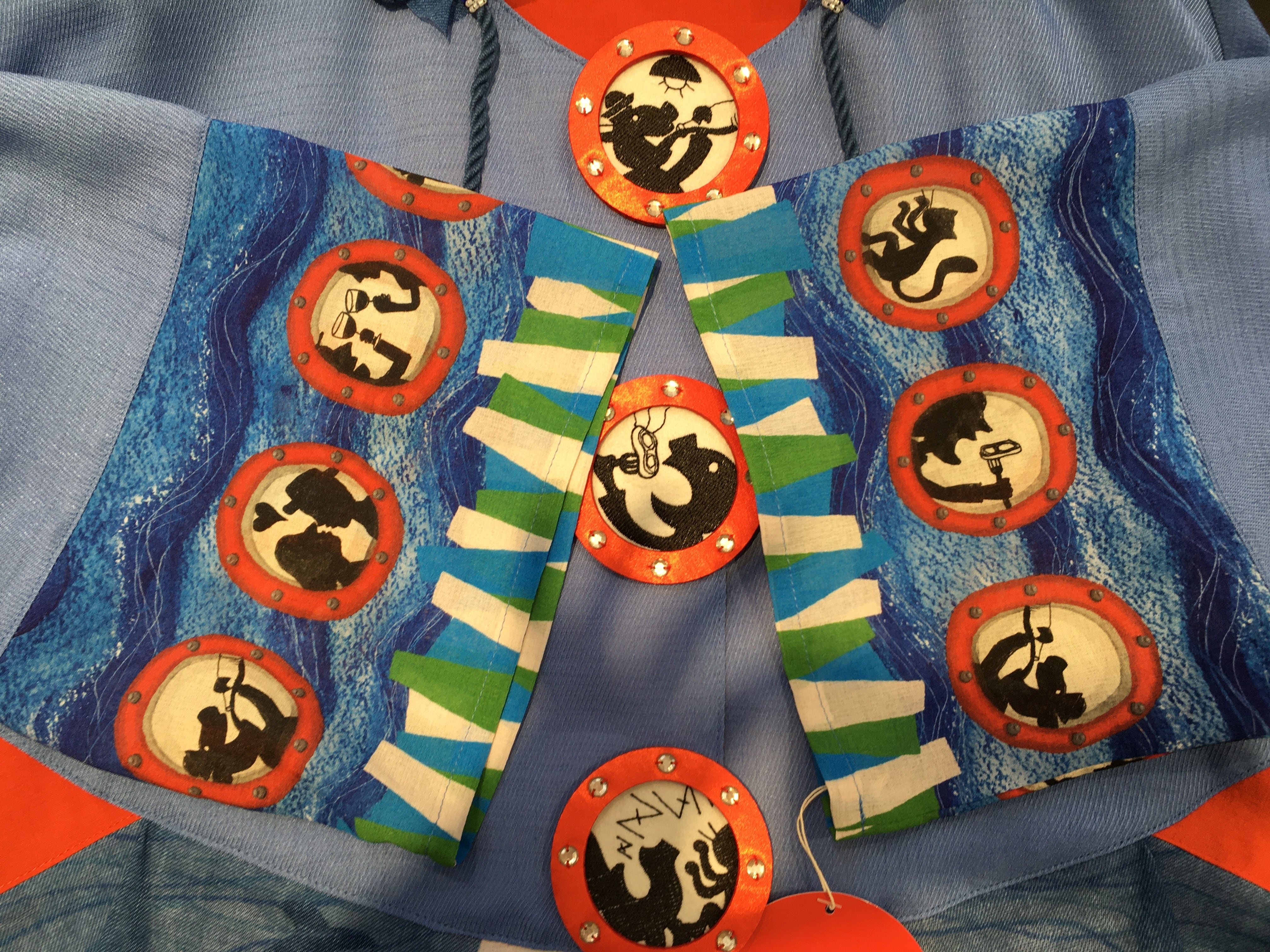 船室の窓がボタン部分と袖に描かれ、一つ一つ違った船内の様子が描かれています。