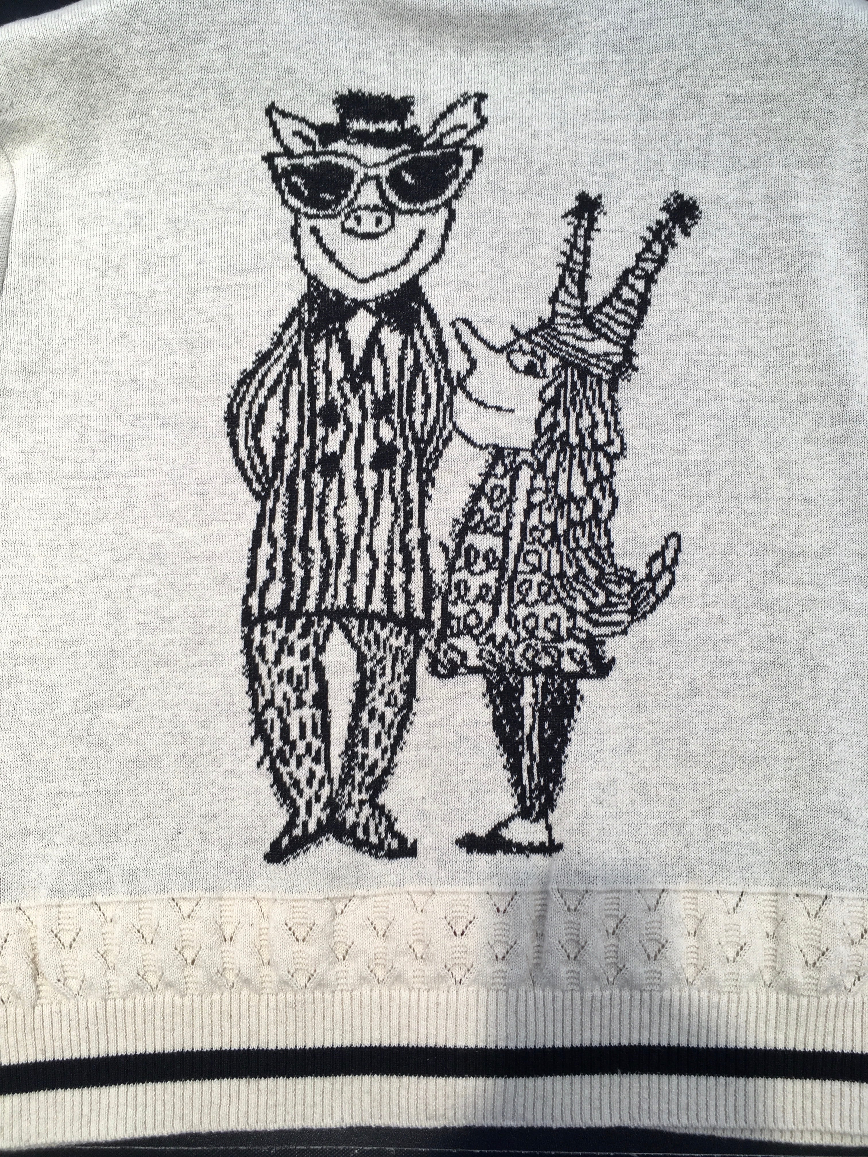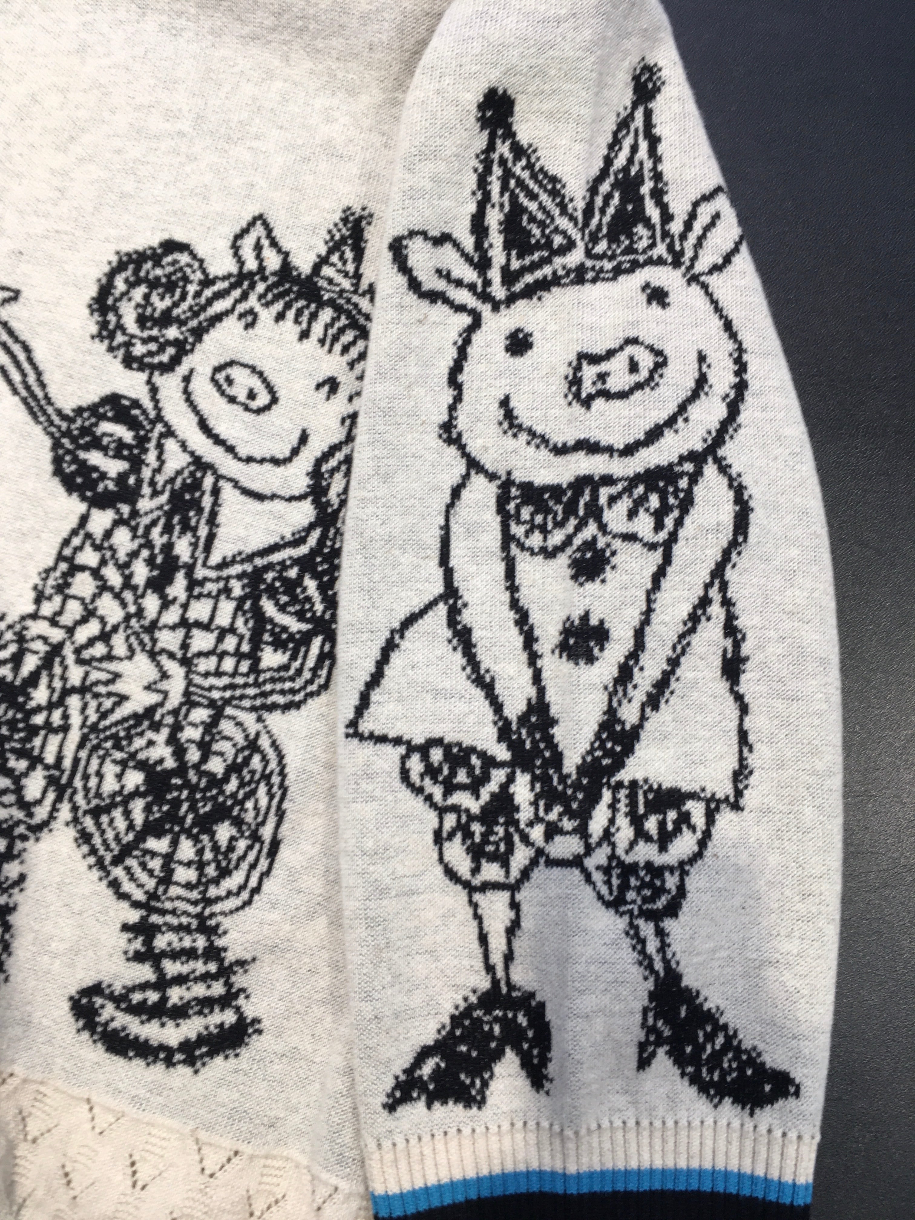 ベージュ色に黒の絵柄が映え、袖と首元の青と赤がアクセントでお洒落です。