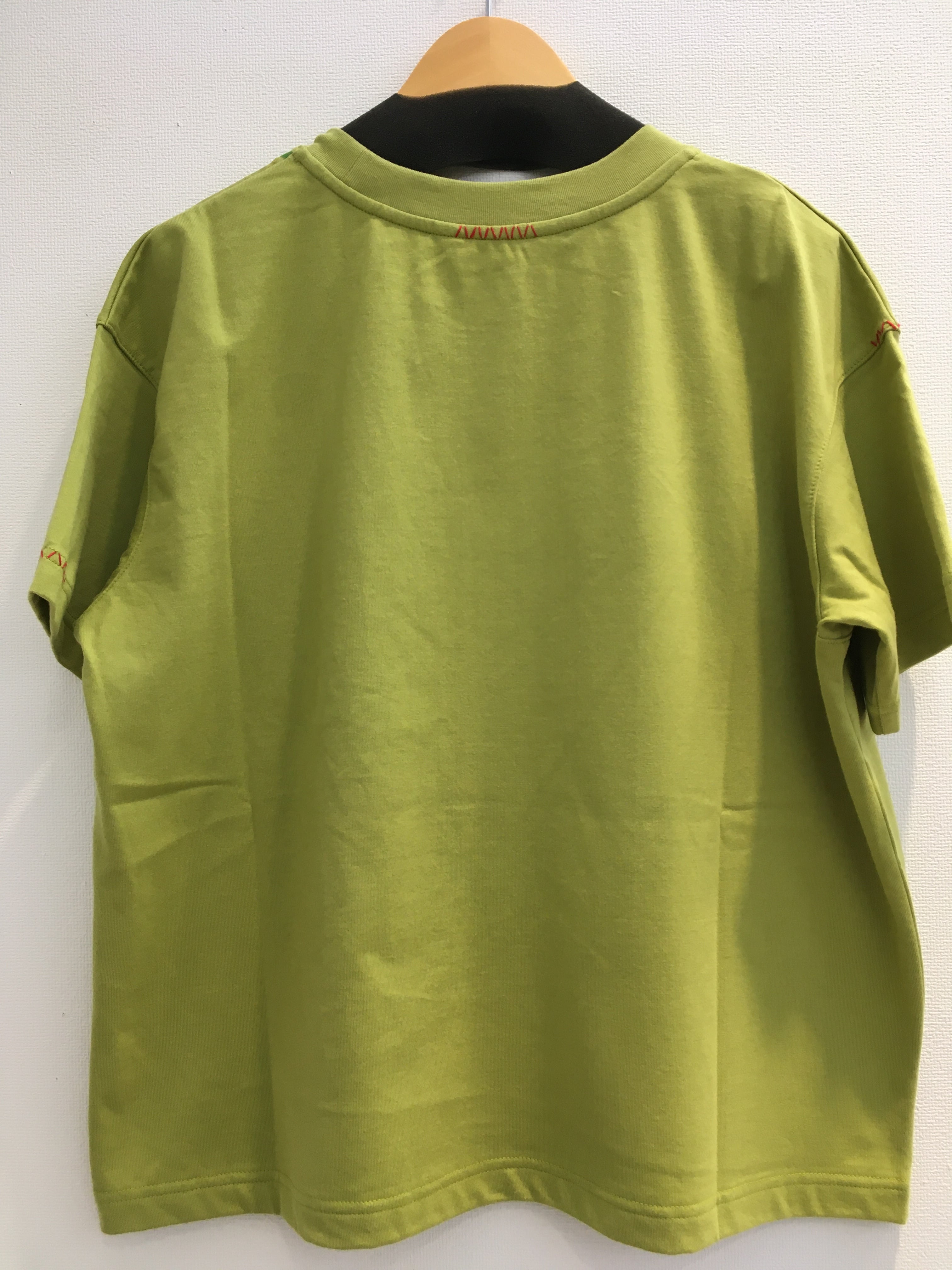 首元や袖に赤のステッチが入っています。