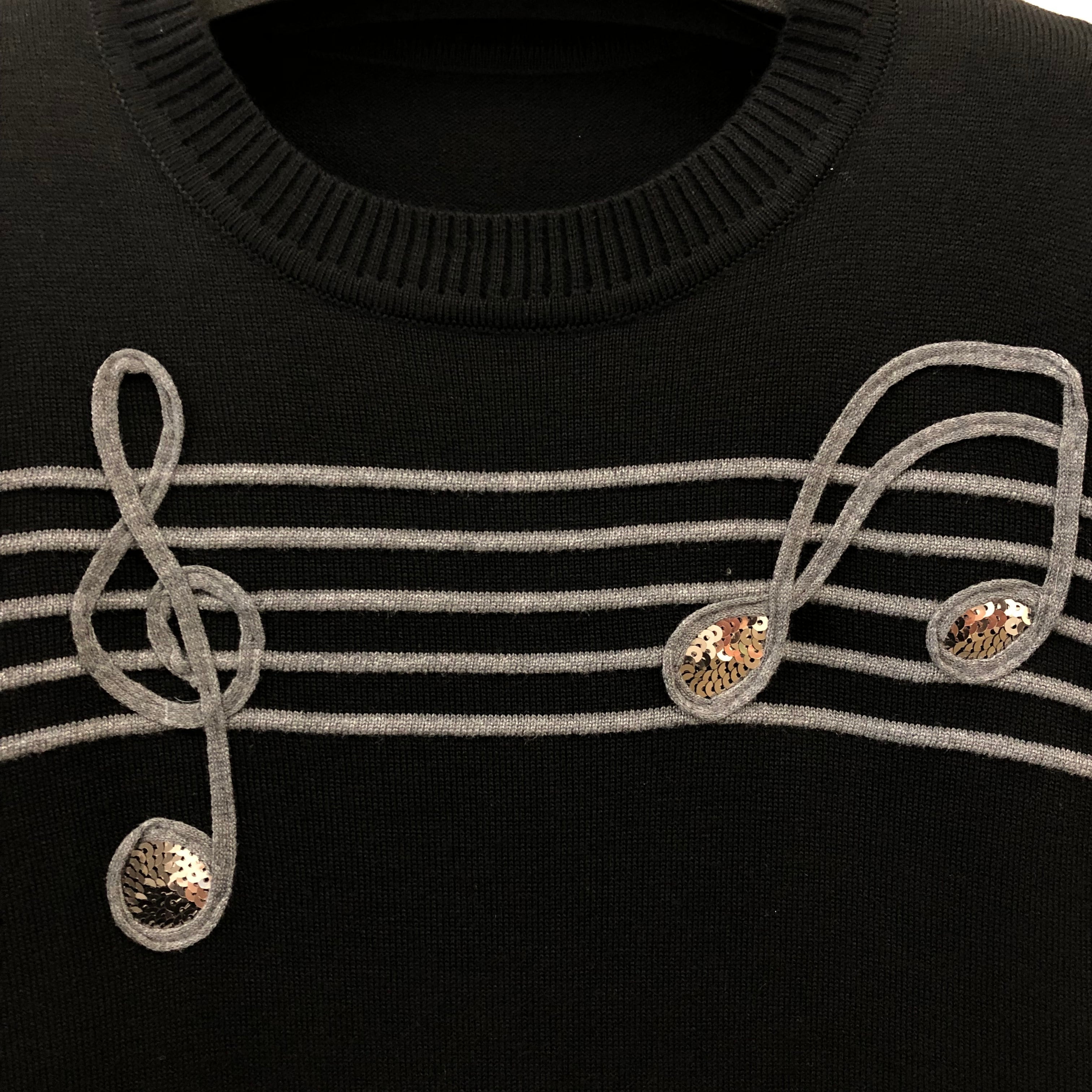 ミナトオリジナルのスパンコールとコード刺繍の音符柄セーターです